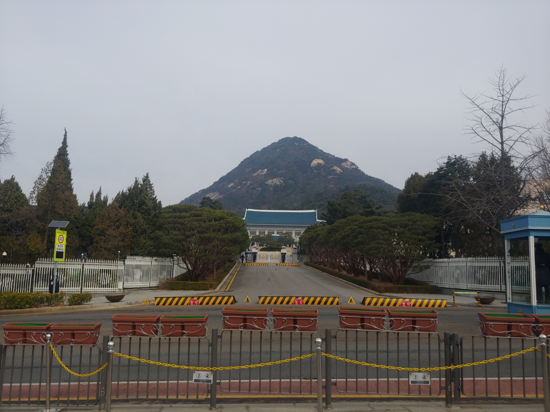 경복궁 안에서도 마지막 코스를 관람할 때도 뒷편으로 높은 곳에서 경비를 서는 듯한 사람들이 보였는데 이 주변에도 그런 사람들이 있었다. 지은 죄도 없는데 괜히 긴장을 하게 되고. 다행히 포토존이라고 만들어 놓은 곳이 있어서 사진 하나를 찍었다.