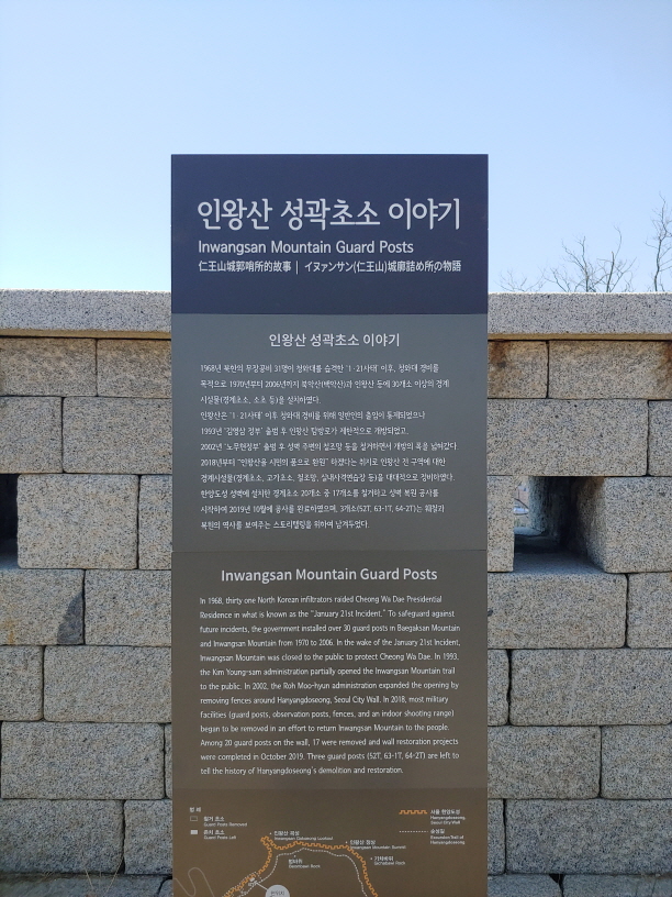 사실 작년 10월에 '순성놀이'에 참여하려고 했었다. 참가비 만원을 내고 하루에 한양도성 순성길을 완주하는 행사이다. 50명인가 100명 단위로, 시계방향으로 도는 그룹과 반시계방향으로 도는 그룹을 선택할 수 있었다. 완주가 부담스럽다면 하프 코스로 절반만 돌아도 된다. 아무것도 모르고 신청했다가 일이 있어서 취소했는데, 이날 인왕산 구간을 걷고 나니까 하루에 한양도성 순성길을 다 걷는 것은 정말 힘들 것 같다는 생각이 들었다.