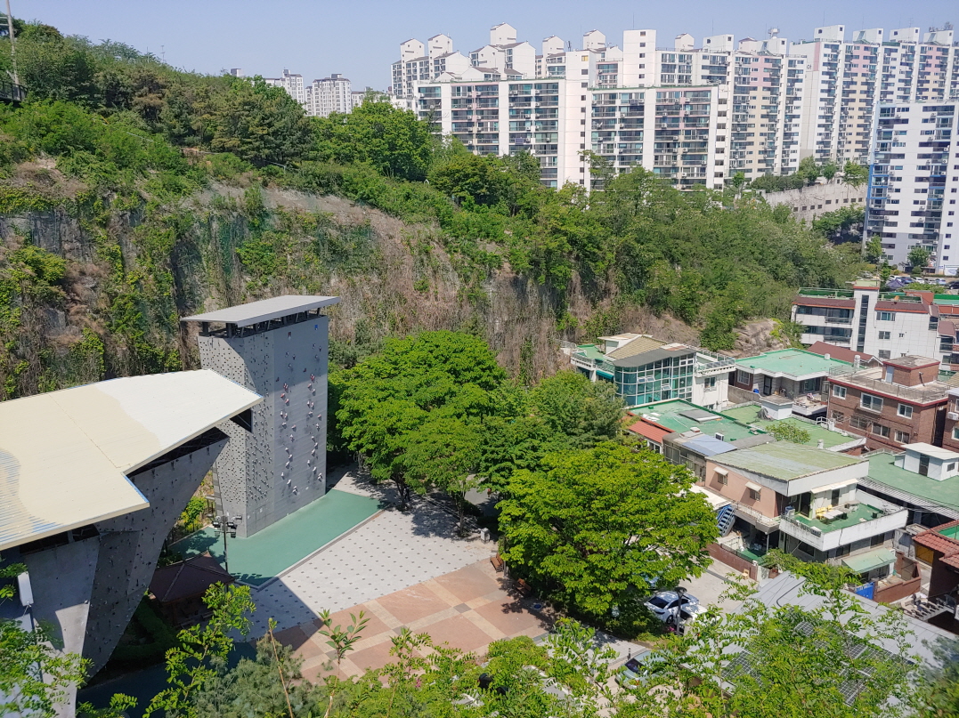 이 아래쪽이 절벽이다. 아래 두 개가 암벽 등반하는 곳. 응봉산 인공암벽공원이다.