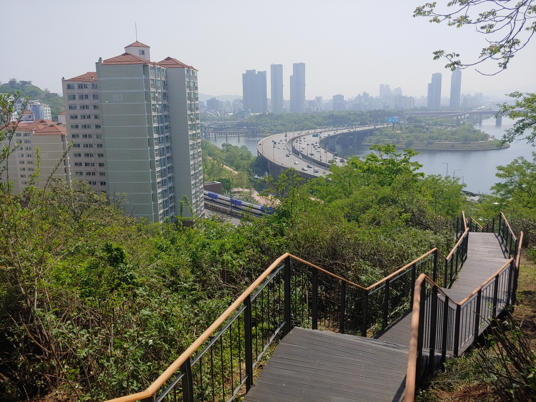저 앞에 보이는 것이 서울숲이다. 내려가서 서울숲까지 가려다가 다음에 가기로 했다. 서울숲이 넓어 보였기 때문. 시간이 좀 걸릴 것 같았다. 언제가 될지는 모르겠지만, 달맞이 공원과 응봉산에 야경을 보러 다시 갈 것이다. 개나리가 피는 봄에도 다시 오고 싶다.