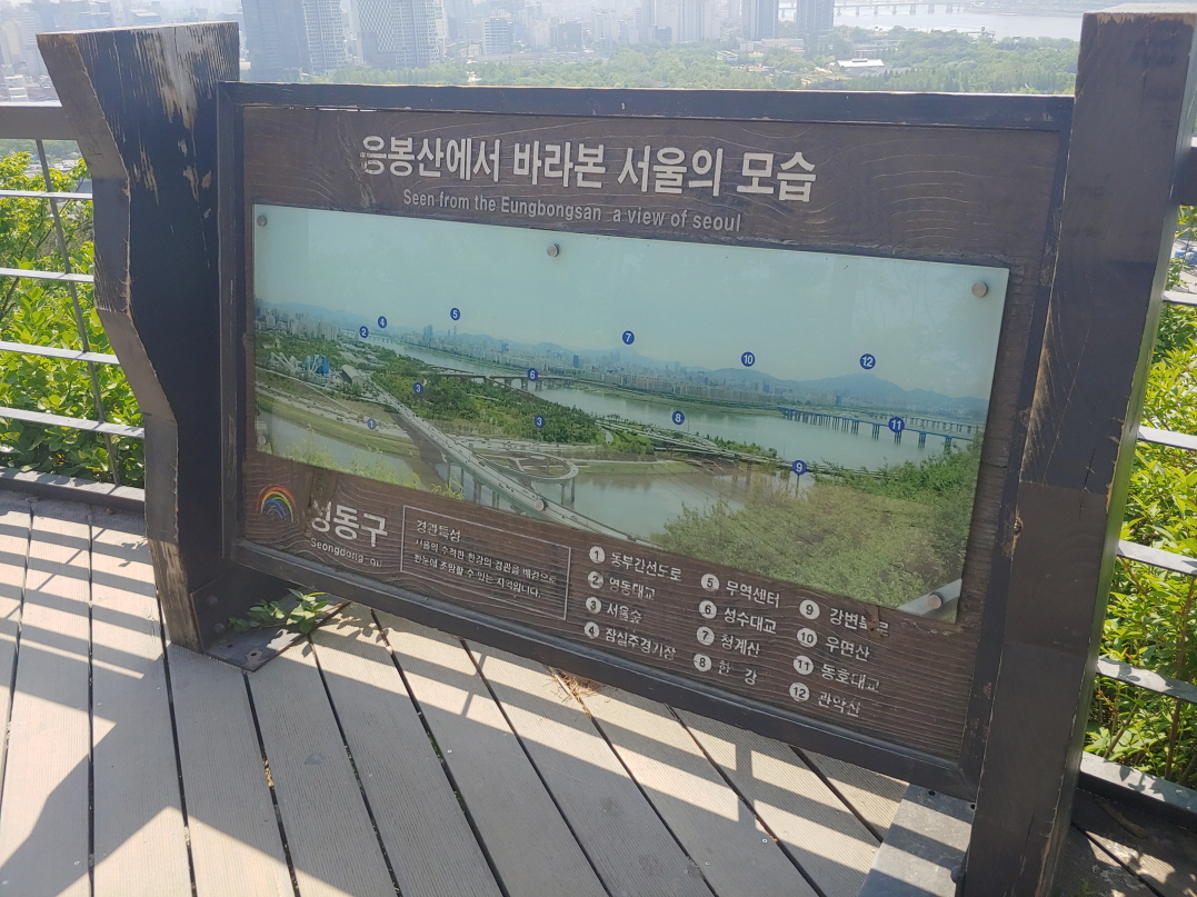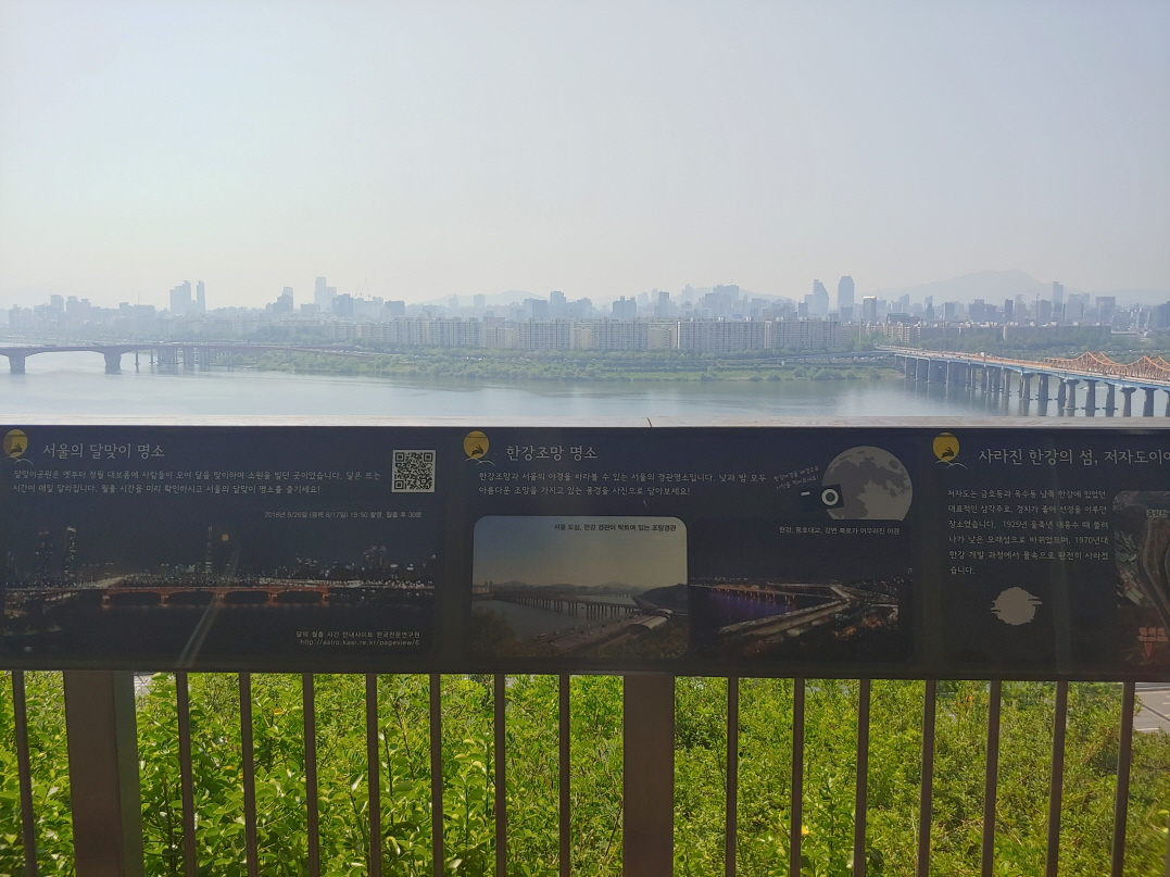 잠시 쉬었다가 다시 조금 올라가자 달맞이 공원 명소에 도착했다. 서울의 달맞이 명소, 한강조망 명소 등이 적혀 있었다. 오전이라 역광이었다. 일단 사진을 찍어봤는데 다행히 글씨가 보인다. 야경으로 유명하다고 하니 밤에 오면 전망이 멋질 것이다. 언젠가 밤에도 오고 싶다.