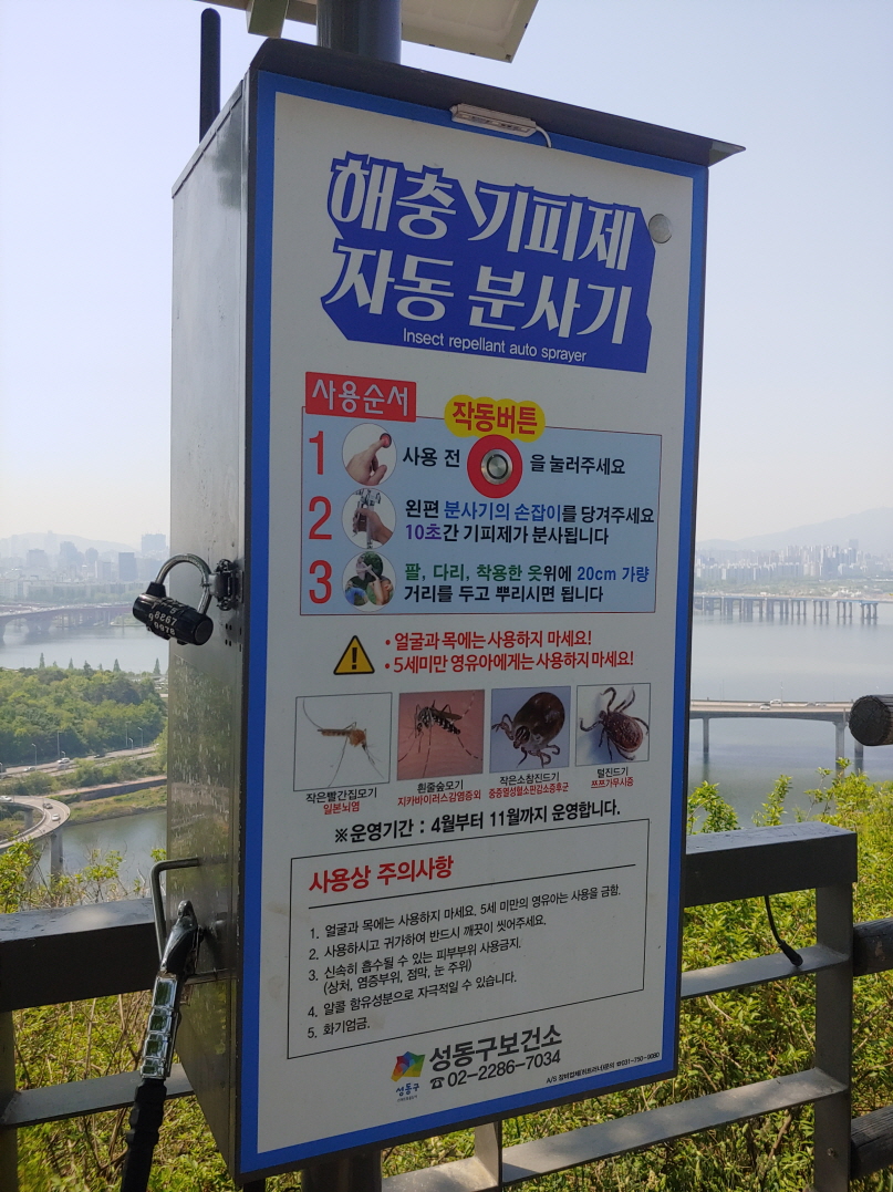 정상에 올라가니 이게 딱 보였다. 뿌릴까 하다가 다 올라와서 무슨 의미가 있나 하는 생각이 들었다. 응봉역 쪽이 아닌 내가 올라왔던 길 쪽으로 내려갈 때에는 뿌리면 의미가 있으려나. 호박벌이 접근을 안 할지 모르겠다.