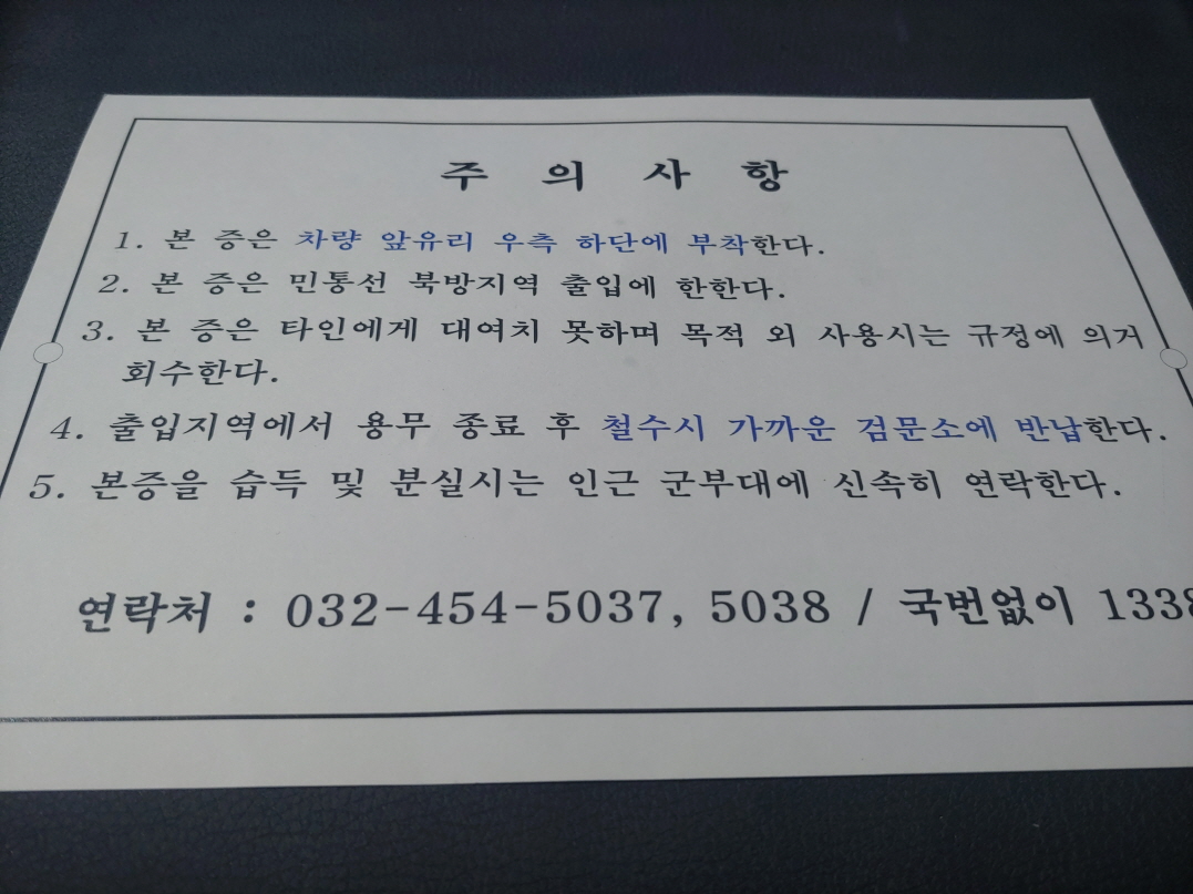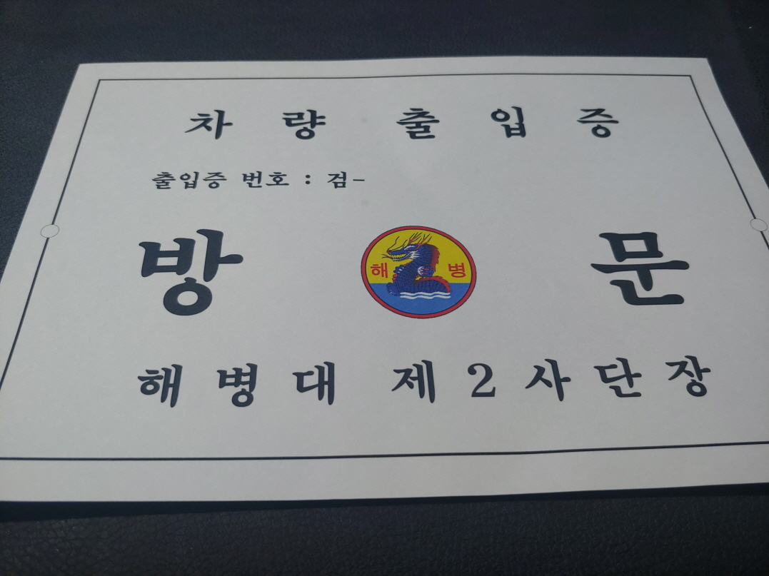 참고로 교동도에 들어갈 때에는 아래와 같은 출입증을 받아야 한다. 까다로운 절차는 없고 검문소를 지날 때 이름, 연락처, 차량번호 정도만 적어내면 된다.