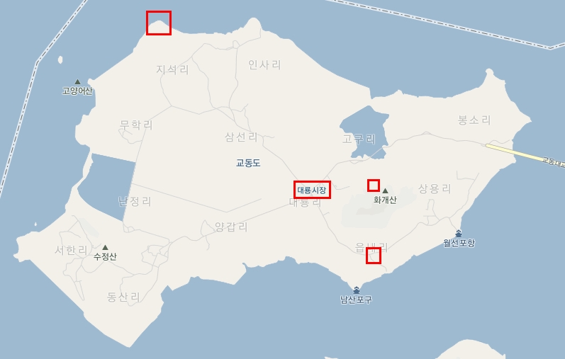 왼쪽 위가 망향대, 대룡시장 오른쪽이 연산군 유배지, 오른쪽 아래 사각형이 교동읍성이다. 교동읍성 근처에 교동향교도 있는데 생략했다. 나중에 사진을 보니까 교동읍성보다 훨씬 나아서 안 갔던 것을 후회했다.