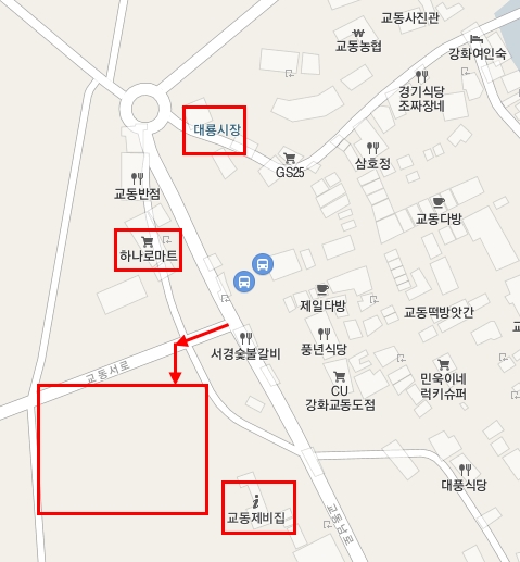 위 사진에 나오는 지도를 자세히 보면, 모바일에서는 잘 안 보일 것 같은데 아래쪽에 교동 제비집, 화장실, 주차장이 있다. 주차장에 대해서는 대룡시장 마지막 부분에 자세히 적겠다.