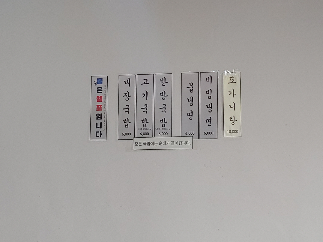 내장국밥, 고기국밥, 반반국밥, 물냉면, 비빔냉면 모두 6,000원