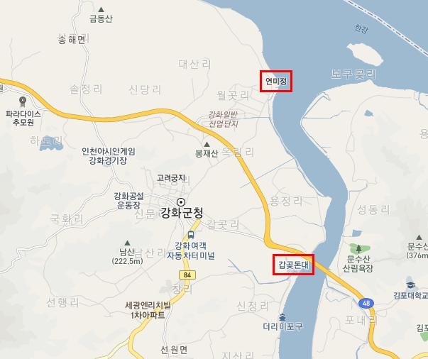 강화대교에서 멀지 않다. 강화도의 주요 도심이자 여러 관광지가 있는 강화읍 북측에 있다.