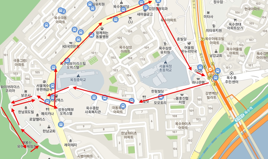 옥수동에서 이동한 경로
