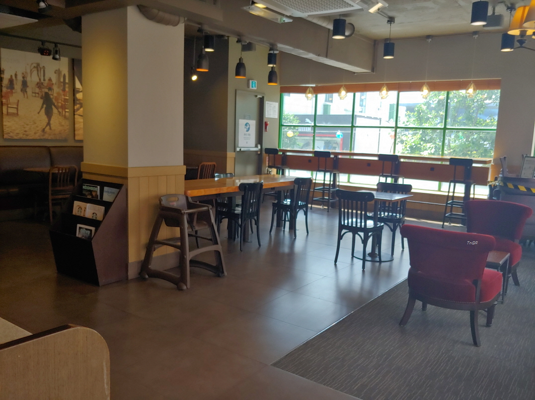 어디선가 규모가 작다고 봤는데 3층 규모에 이 정도면 자리가 적은 것은 아니다. 사진 오른쪽 구석에 살짝 보이는 것이 코로나로 인한 '거리두기'를 위해 매장 내 일부 테이블 및 의자를 치워놓은 것이었다.