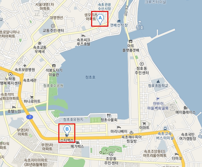 녹색 외관으로 알려진 스타벅스는 중앙시장 근처에 있었고 (지도상 A) 그 이후에 생긴 것으로 추정되는 DT점이 청초호 유원지 근처에 있다. (지도상 B) 나는 중앙시장 근처에 있는 스타벅스 속초중앙로점에 다녀왔다.