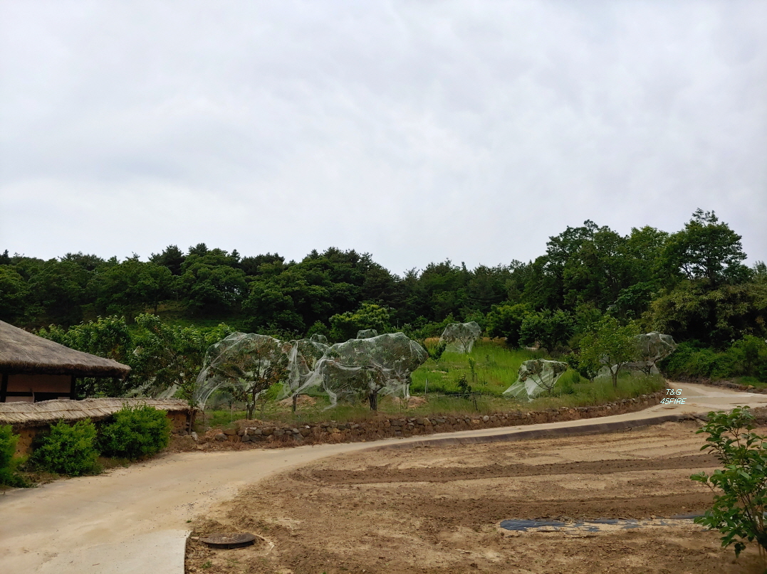 한쪽에는 나무를 흰 그물 같은 것으로 덮어놨다. 병충해 방지용인지.