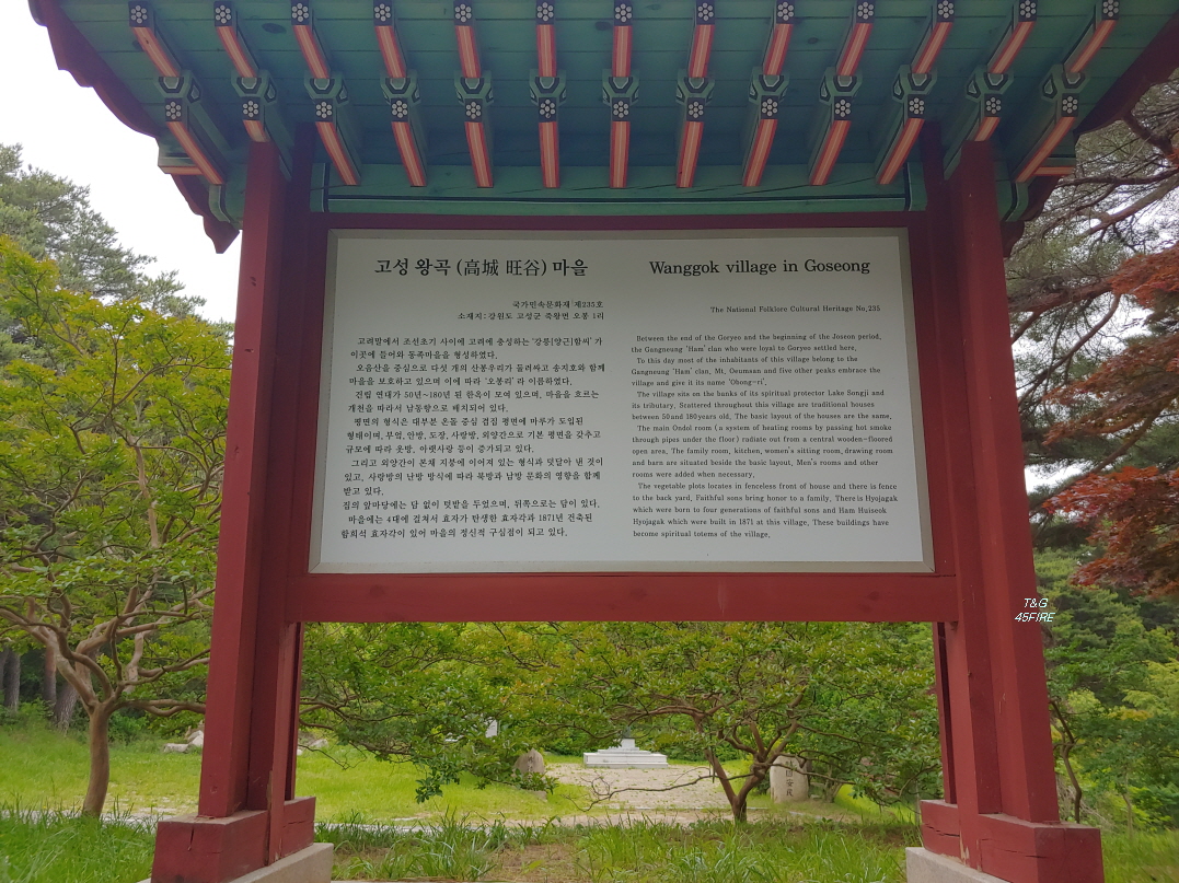 다른 곳에서 쉽게 볼 수 없는 전통마을이 있다는 것이 나름 의미가 있다고 생각한다. 그런데 관광객으로 보이는 어떤 아줌마는 '그냥 시골 마을이네!'라고 말하며 돌아다녔다. 좀 나이가 있으신 분들은 어릴적부터 이런 마을 모습을 보고 자라서 고성 왕곡마을의 모습이 실망스러울 수도 있다. 하지만 도시에서 자란 아이들에게는 충분한 볼거리가 아닐지. 전통마을보존지구라 여기 사는 사람들은 불편함을 감수하고 집도 마음대로 고치지 못하고 사는 것이다.