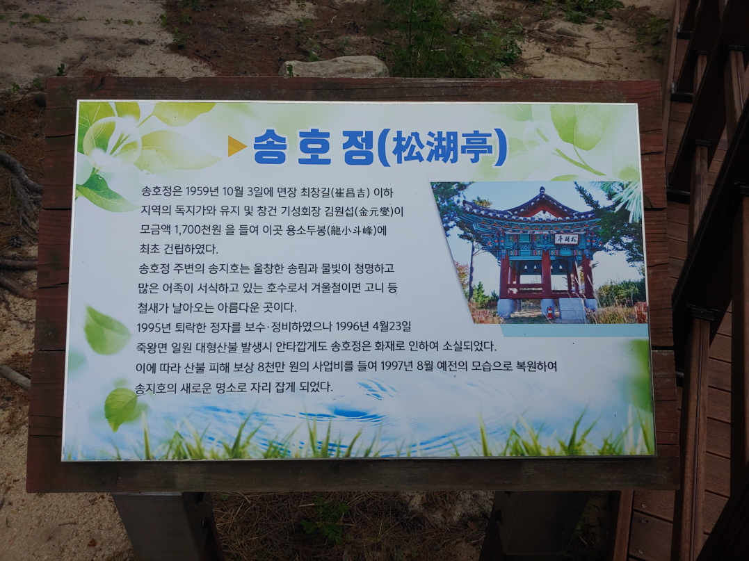 호수 건너편에 보이는 것이 송호정이다.