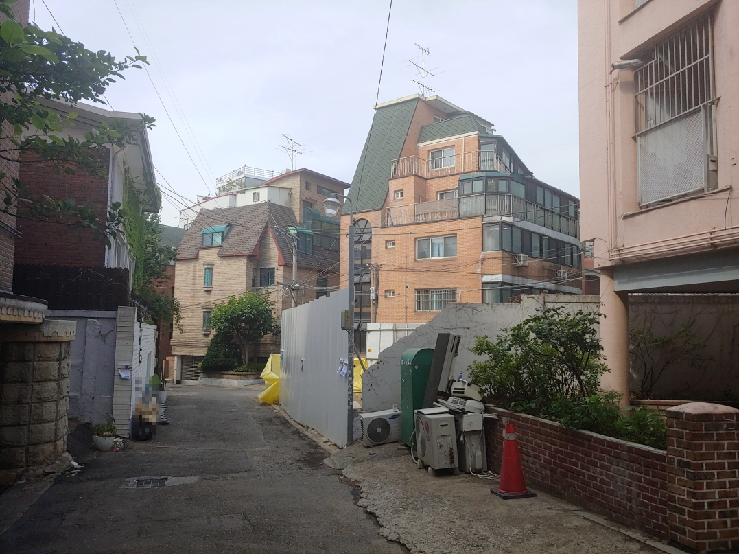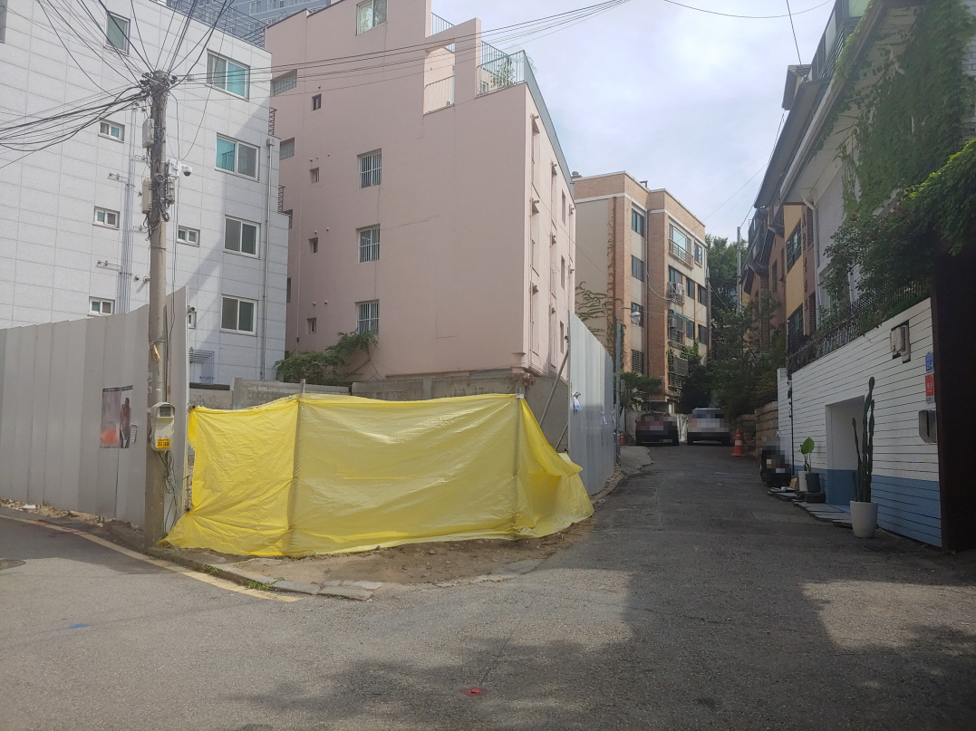 바로 앞에 공사중인 곳이 있었다. 철거가 막 끝난 상태 같았다. 몇 개월 안에 신축 건물이 올라가지 않을까. 성보빌라트는 97년 건물인데 주변에는 그 이후에 지어진 것처럼 보이는 건물들이 있다. 그리고 바로 이 현황 도로(지번 395-92, 지목: 대)가 어느 종중 소유로 되어있다고 한다.