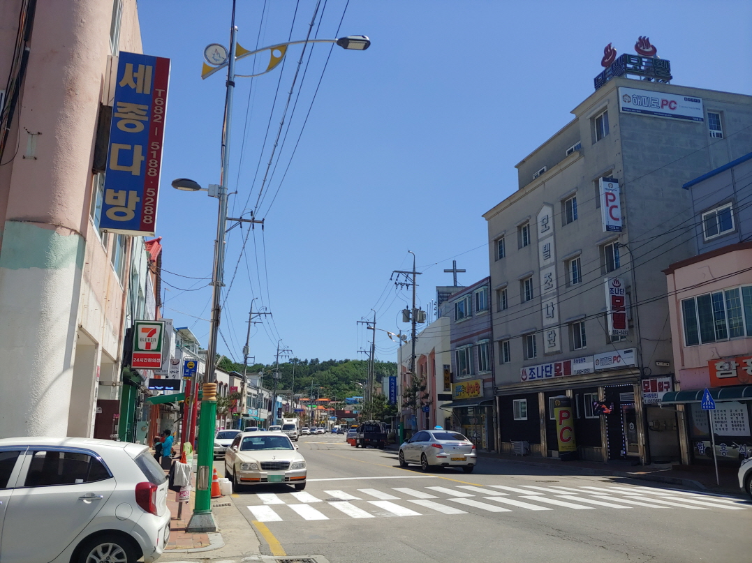 거진항에서 한 블록 정도 들어온 곳의 도로변 건물들