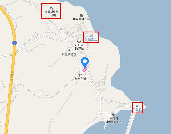 저 뒤쪽으로 가면 가진해변과 스퀘어루트가 나올 것이다.