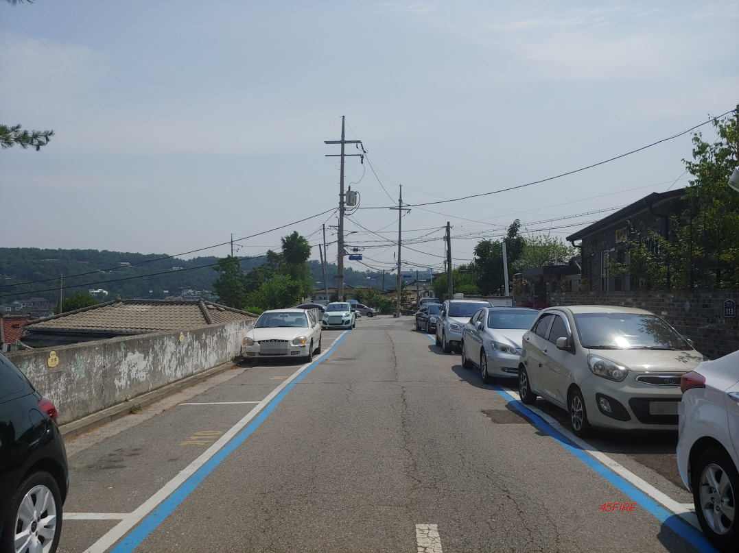 큰 도로를 따라 한 바퀴 돌고 내려갔다. 도로는 이런 모습이었다. 아무래도 주차공간이 부족할테니 도로 양옆으로 주차할 수 있는 공간을 만들어놨다.