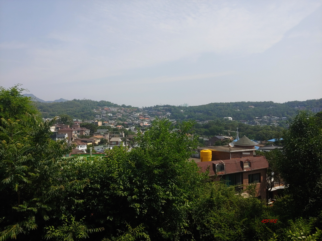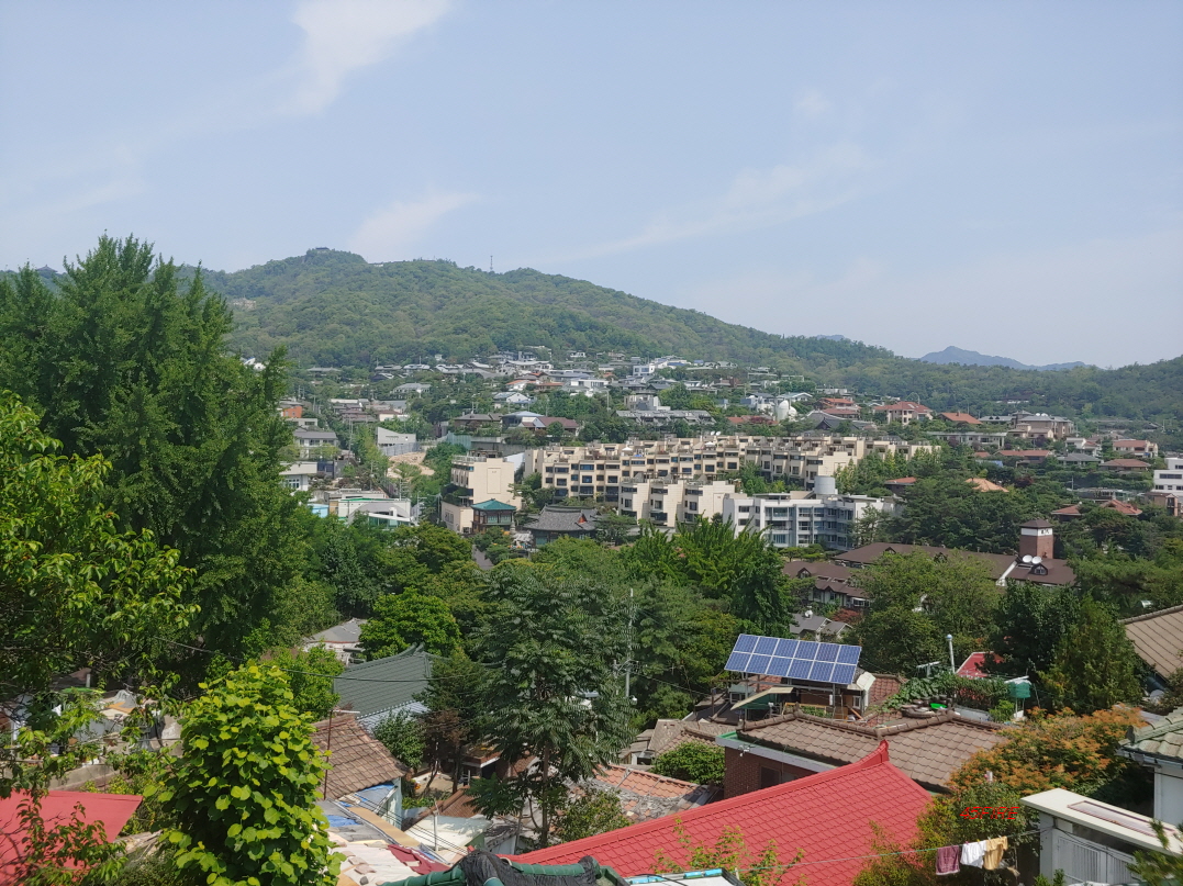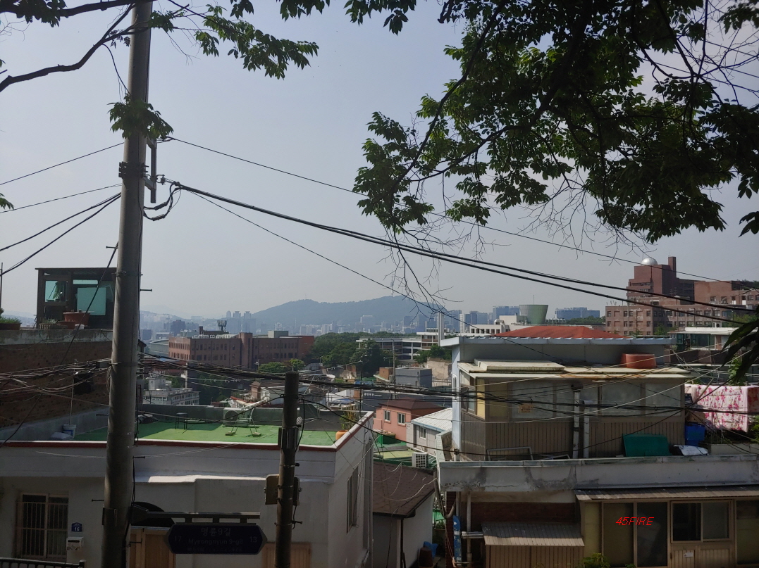 서울성곽으로 가기 전에 벤치가 있어서 잠시 앉아서 쉬웠다. 가까운 곳에 주택들이 모여있고 저멀리 성균관대학교와 서울타워까지 보였다. 적당한 높이의 건물을 짓는다면 전망이 나쁘지는 않을 것이다.