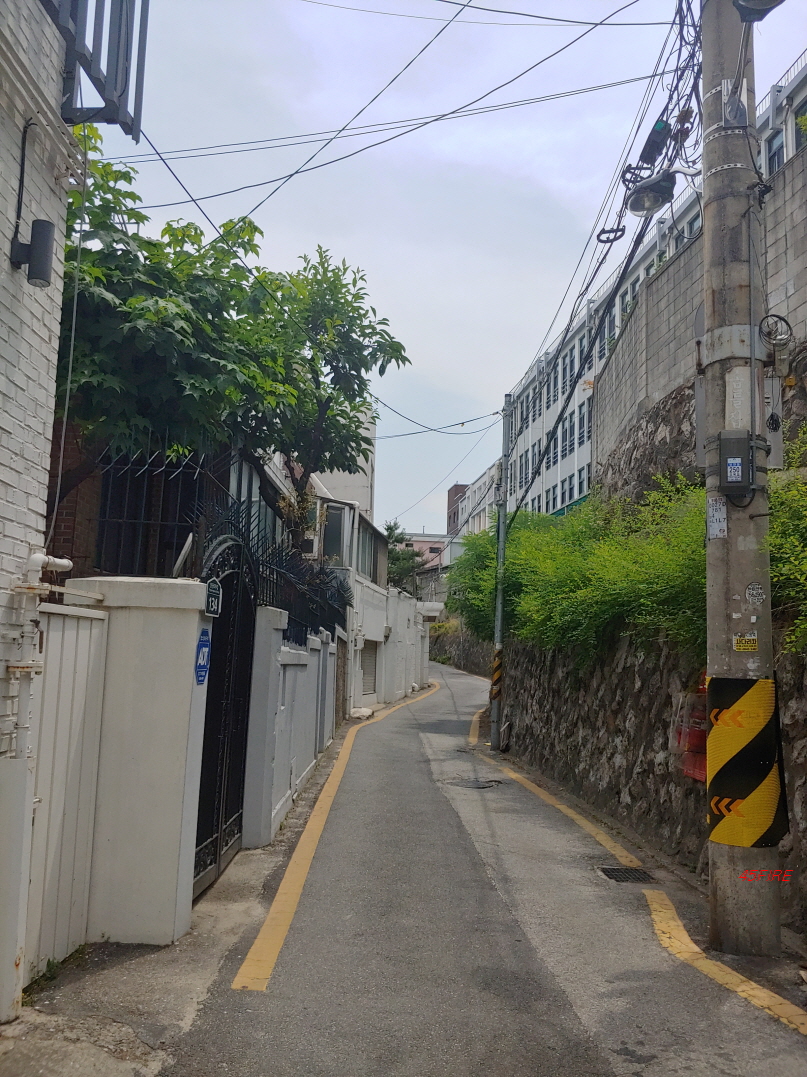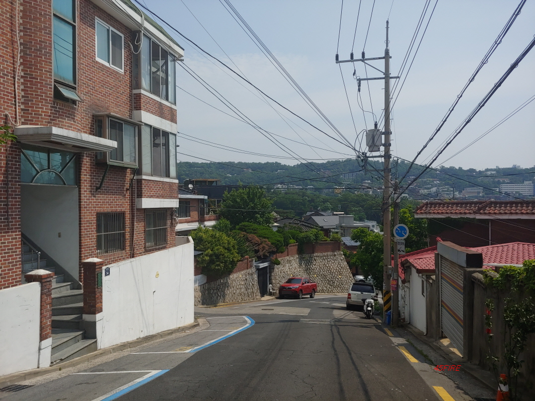 경매 물건을 살펴보고 서울성곽쪽으로 올라갔다. 날도 더운데 언덕길, 계단을 올라가려니 무척 힘들었다. 위 사진상 위쪽에 있는 건물은 외관을 새로 페인트칠하고 내부 인테리어 공사도 했을 것 같다. 80년대나 90년대에 지어진 적색조 벽돌의 건물도 페인트칠만 새로 해도 새로운 느낌이 난다.