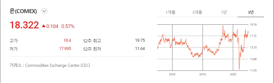 카카오 증권에서 찾아본 은 가격이다. 현재 온스당 18.322달러이다.