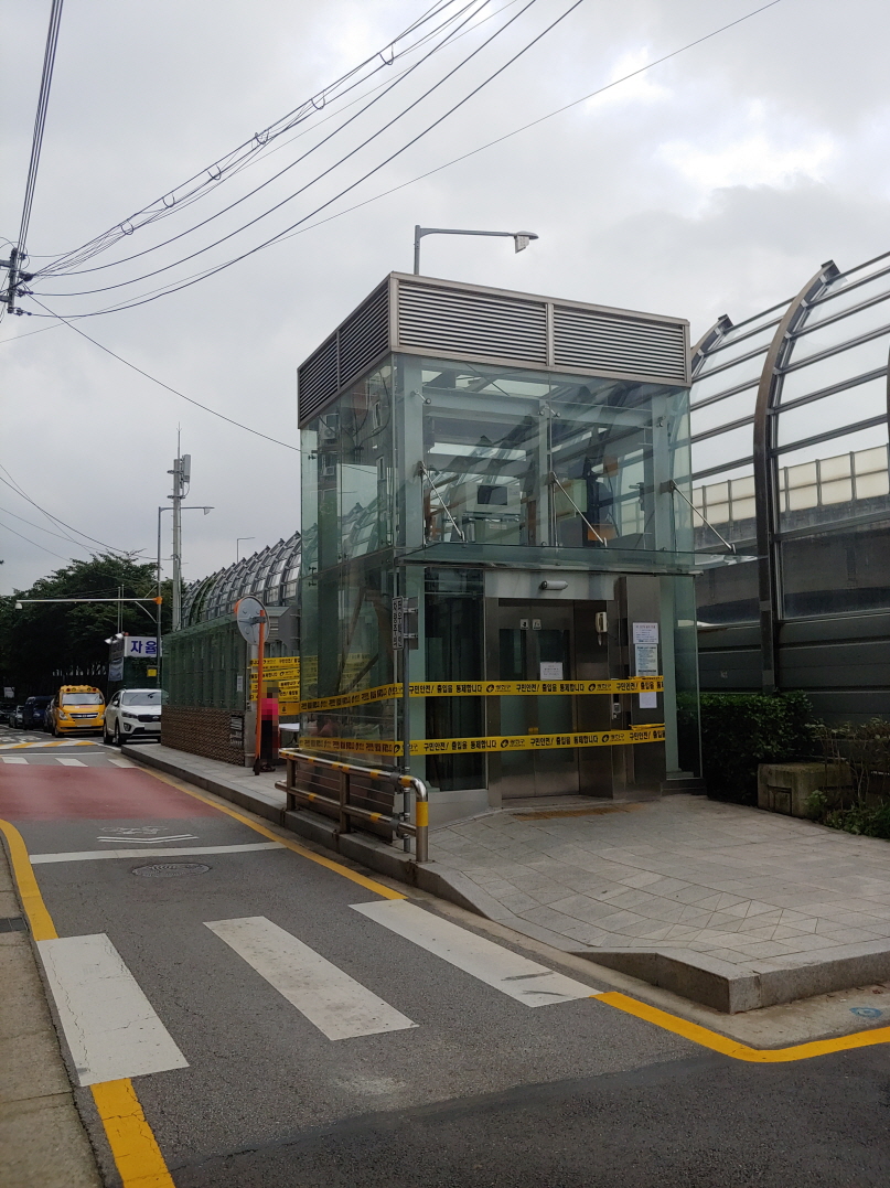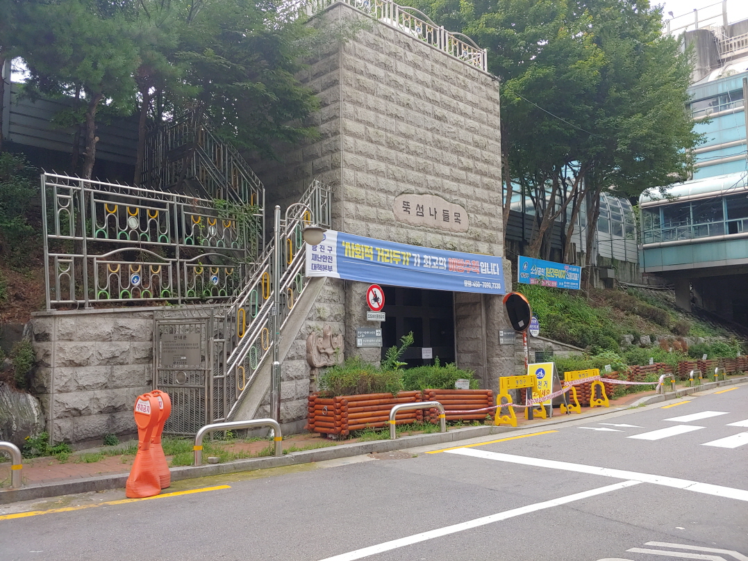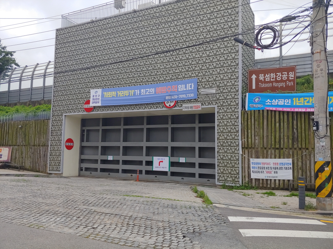 뚝섬유원지역 바로 옆에 있는 뚝섬나들목이다. 여기를 통해 자전거를 끌고 뚝섬한강공원으로 갈 수 있다. 12일에는 통제 중이었다. 사진에는 없지만 다른 쪽에서는 연두색 조끼를 입은 사람들이 통제를 하고 있었다.