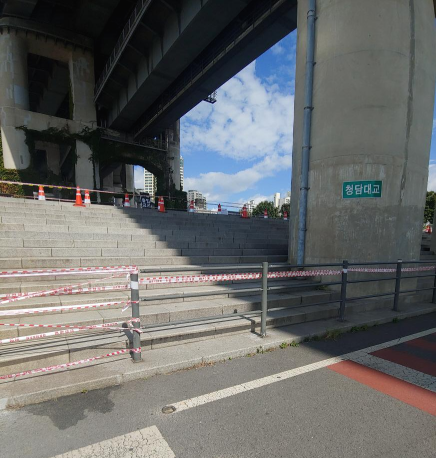 아래 사진처럼 청담대교 바로 아래도 출입통제 중인데 청담대교 좌측도 일부 구역 띠가 둘러져 있네요. 언론에 보도되었듯이 극히 일부인 통제구역을 제외한 나머지 구역에서는 자유롭게 이용이 가능한 상황입니다.