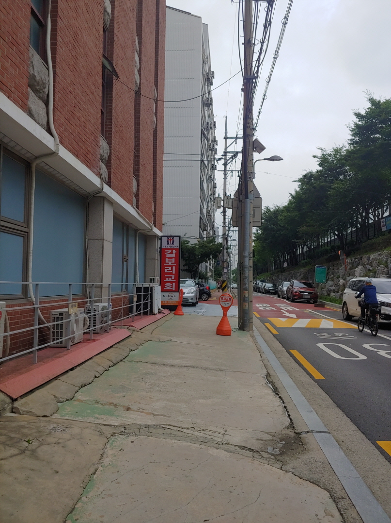 어쩔 수 없이 이 길을 따라 걸었다. 자전거를 타고 한강을 달릴 때 봤던 교회 앞도 지나갔다.