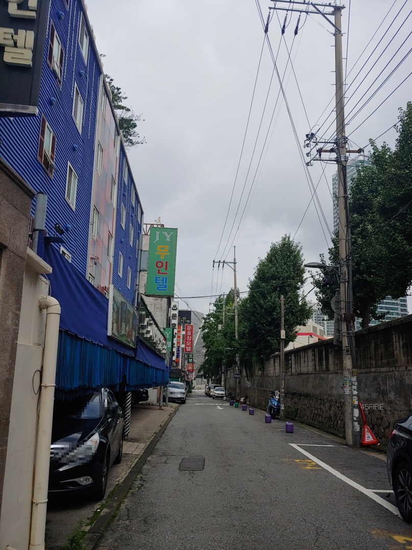 여기가 상봉7구역과 중랑자동차운전전문학원 부지 사이의 길이다. 우측의 높은 담장 때문에 운전학원 쪽으로 사진을 못 찍었다. 이 길을 따라 모텔이 쭉 있었다. 상봉터미널이 있어서 이렇게 모텔이 많은 것일까. 아무튼 이런 모텔의 존재가 재개발 진행에 영향을 줄 거 같다.