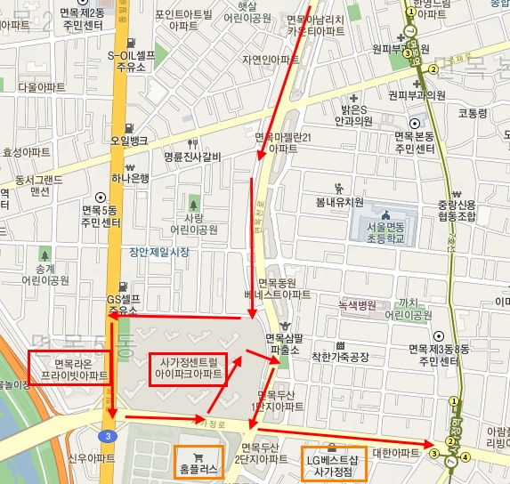 다른 쪽 길 건너편에 홈플러스도 있다. 지하철역에 조금 먼데, 사가정센트럴아이파크와 면목라온프라이빗아파트 사이에 면목선의 역이 예정되어 있다. 면목선이 제대로 진행될지는 알 수 없지만 면목선이 생기면 청량리역까지 접근성이 나아질 것이다. 또 사가정역까지 10분 정도만 걸어가면 되니까 7호선을 타고 강남 쪽으로 갈 수도 있다.