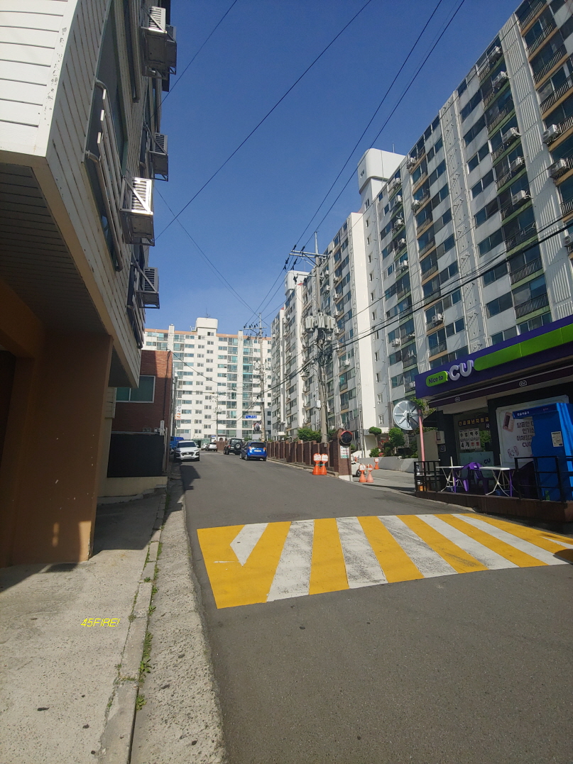 아파트 단지 북쪽으로는 영량호가 있었다. 고층에는 영랑호까지 보일지... 남쪽으로는 교동초등학교가 있어서 등교하는 학생들이 보였다. 큰 도로를 건너야 해서 자원봉사자들이 몇 명 나와서 도와주고 있었다.