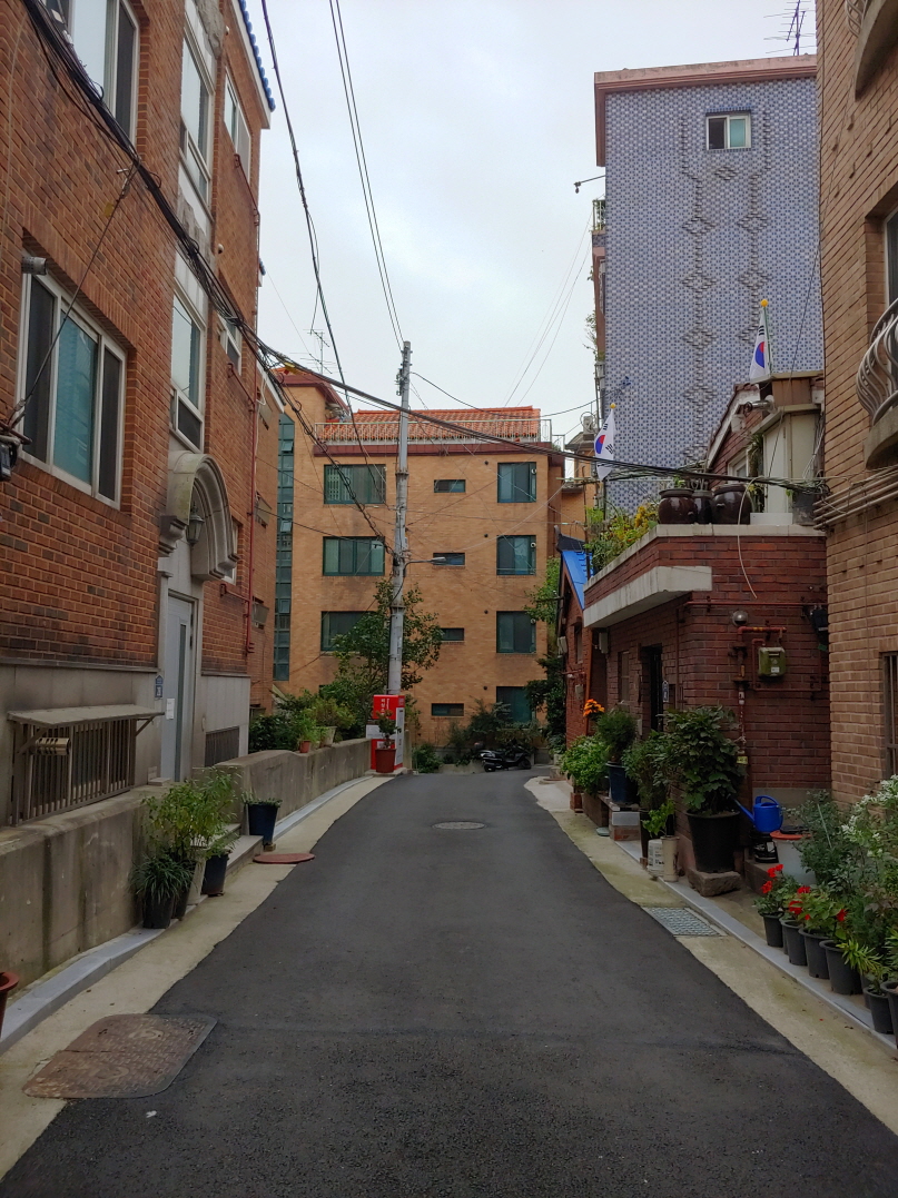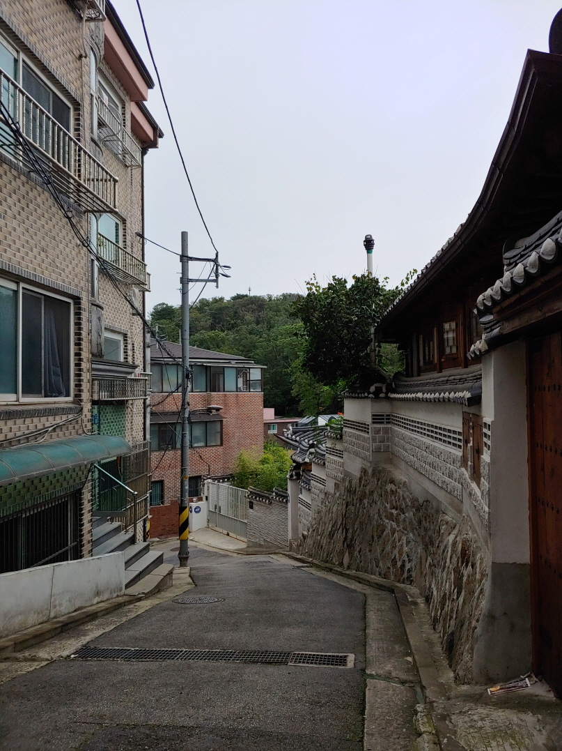 이쪽에도 한옥이 있긴 했다. 한 골목에 담장을 낮춰 놓은 곳이 있었는데 그 담장 넘어로 한옥 지붕들이 많이 보였다.