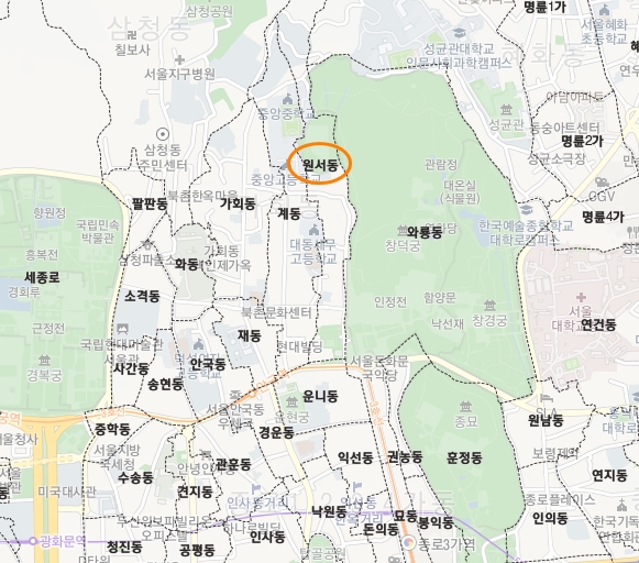 종로구 원서동은 북촌한옥마을과 창덕궁 사이에 있다. 현장을 다닐 때에는 가회동 옆이 원서동인줄 알았는데 지도상 법정경계를 보니까 가회동과 원서동 사이에 계동도 있다.