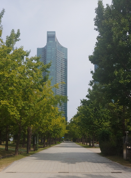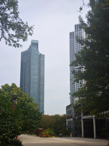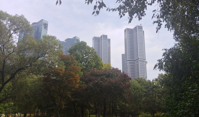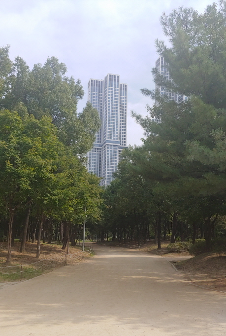 가운데 작은 호수도 있고 그 뒤로 고층 아파트들이 보였다.