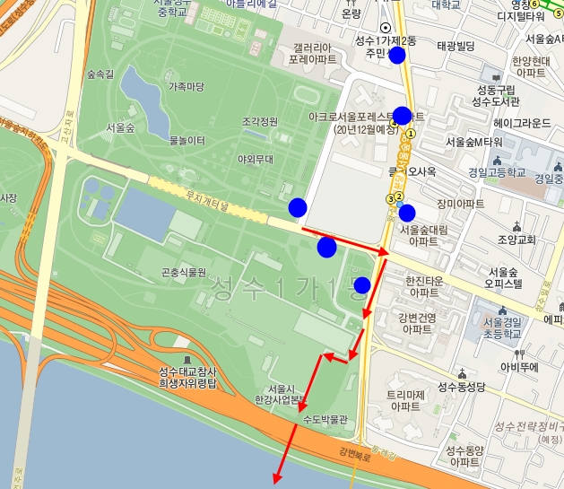 위 지도에서 파란색 원으로 표시한 것이 따릉이 대여소이고, 빨간색 화살표를 따라 가면 한강이 나온다.