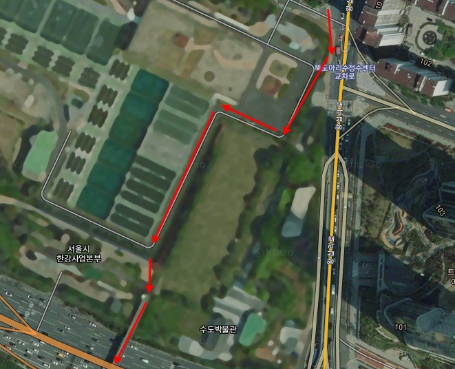 사거리에서 횡단보도를 한 번 건너고 또 작은 횡단보도를 건너서 앞쪽으로 가다가 약간 우측으로 보이는 언덕길을 올라가면 된다. 위성 지도를 보니까 작은 횡단보도를 건너서 바로 오른쪽으로 가도 결국 한강으로 가는 길과 이어지는 것 같기도 하다.