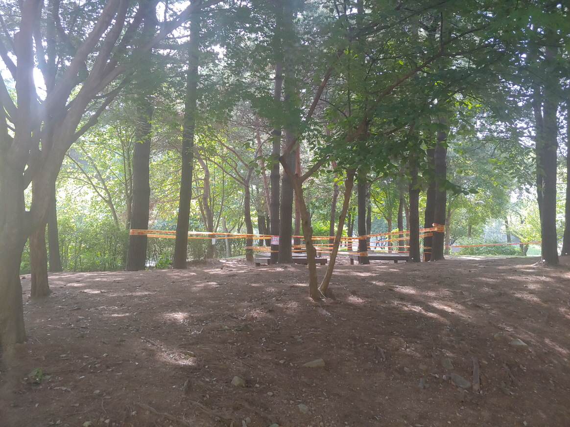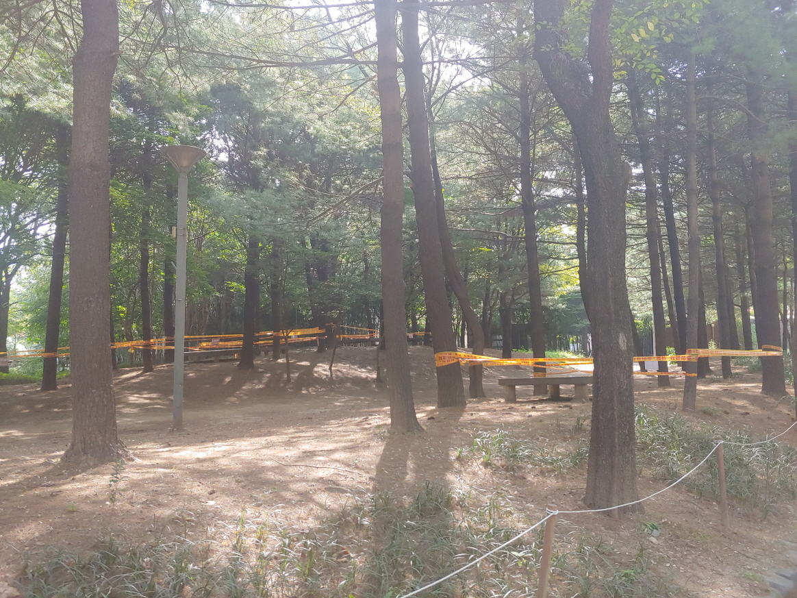 코로나로 인해 곳곳이 통제 중이었다. 평상 같은 것이 있는 공간은 위 사진처럼 출입을 금하는 노란색 띠가 둘러져 있었다. 그 외의 공간에서는 서로 멀리 떨어져서 돗자리를 깔고 쉬는 사람들이 있었다.