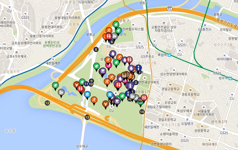 한강 자전거 도로를 따라 자전거를 타고 가다가 서울숲 근처를 지날 때 자전거 출입이 불가능한 공원도 있었고 자전거 출입이 가능한 공원도 있었던 기억이 난다.