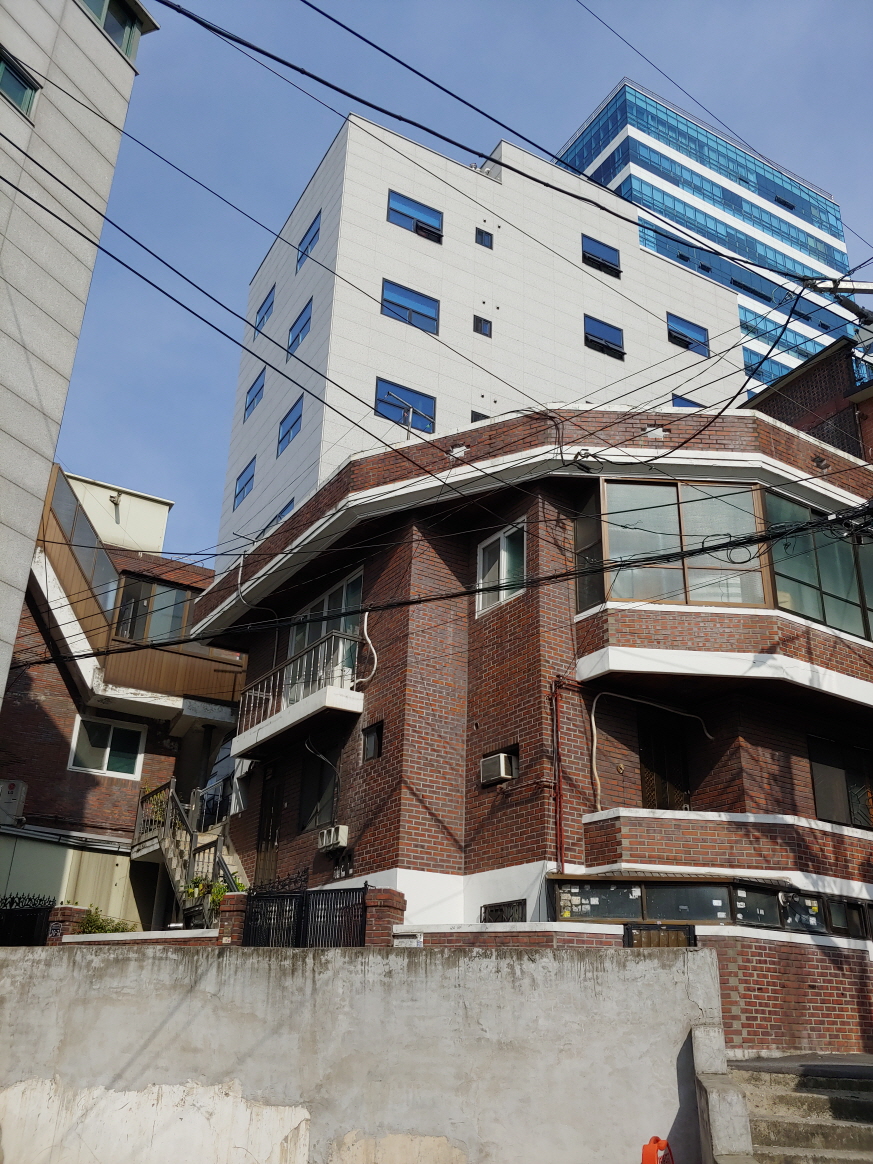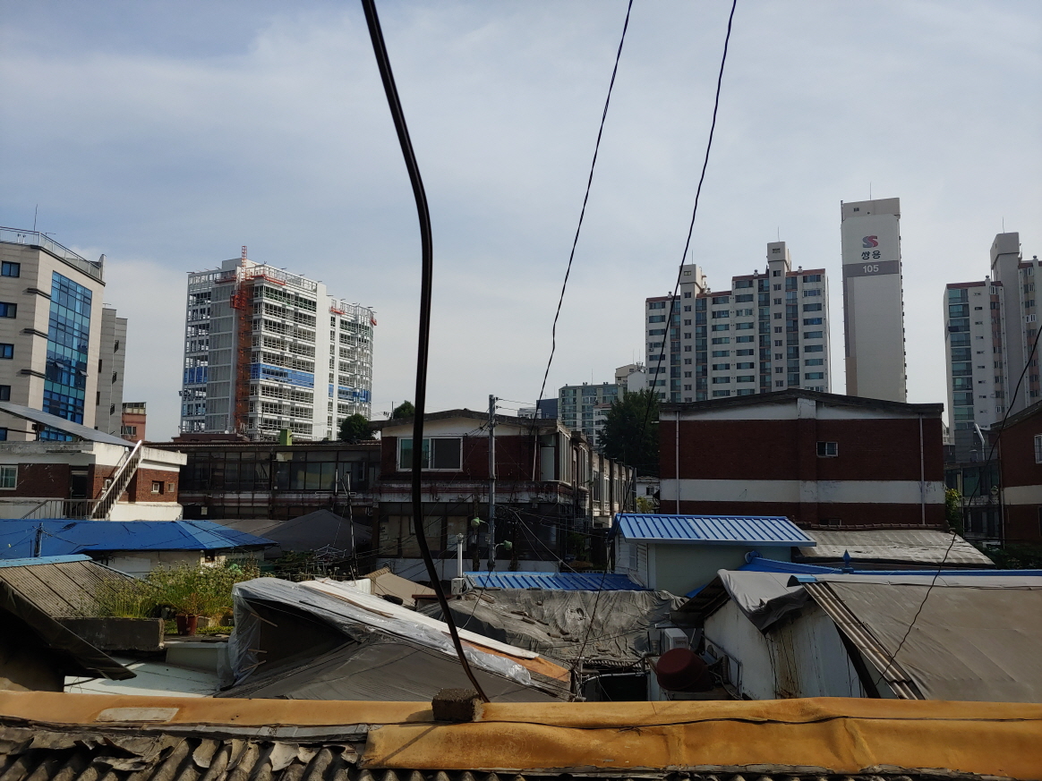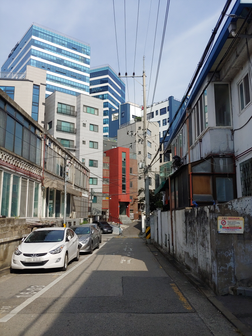 오래된 연립과 빌라 뒤쪽으로는 깔끔한 고층 빌딩이 보였다.