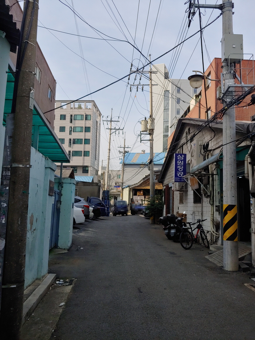 다른 골목. 공장이 보인다.