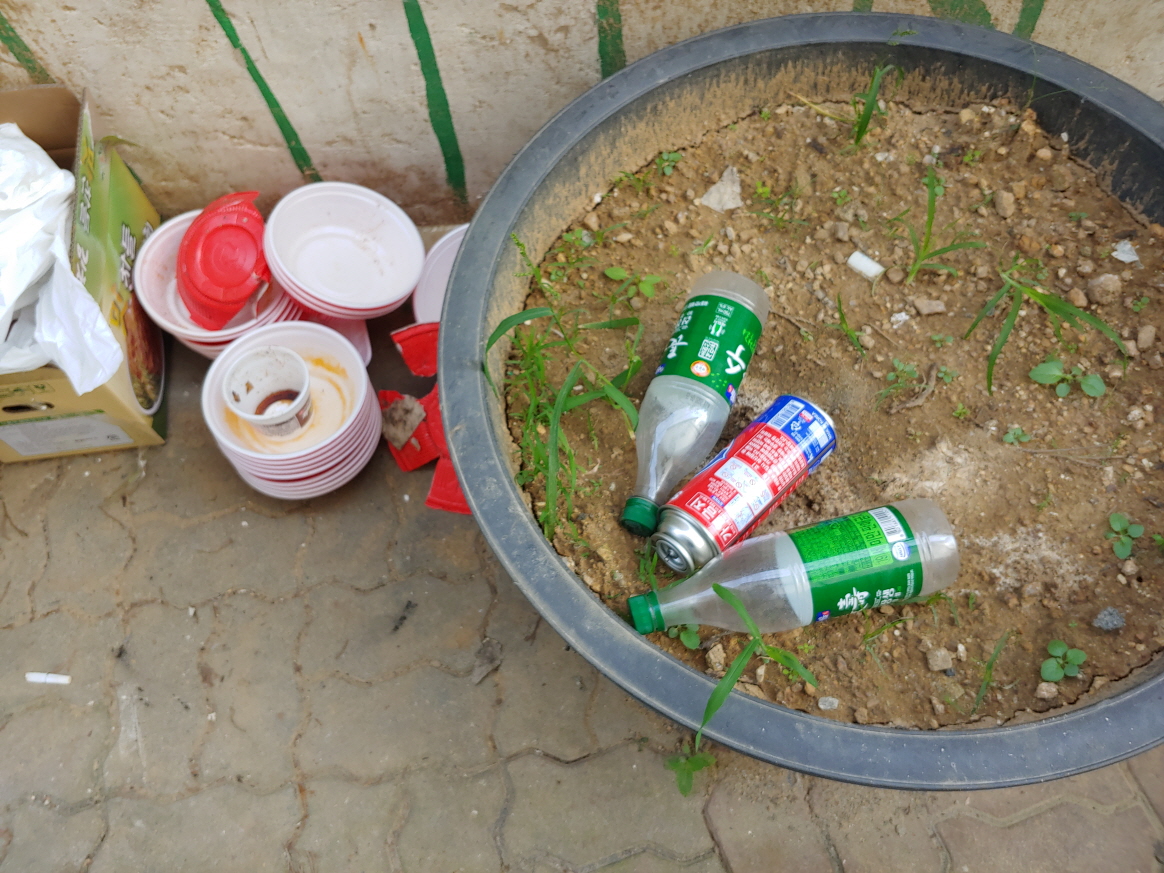 골목에는 막걸리 병과 부탄가스가... 가스까지 마신 것은 아니겠지...
