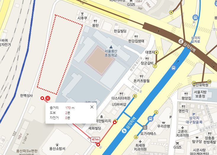 여기는 인근 도로이다. 삼각지역 뒤쪽으로 용산 초등학교가 있는 길이다.