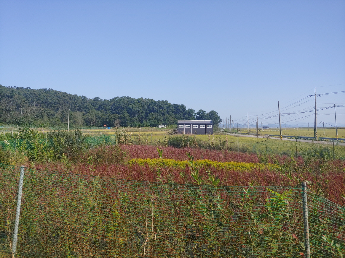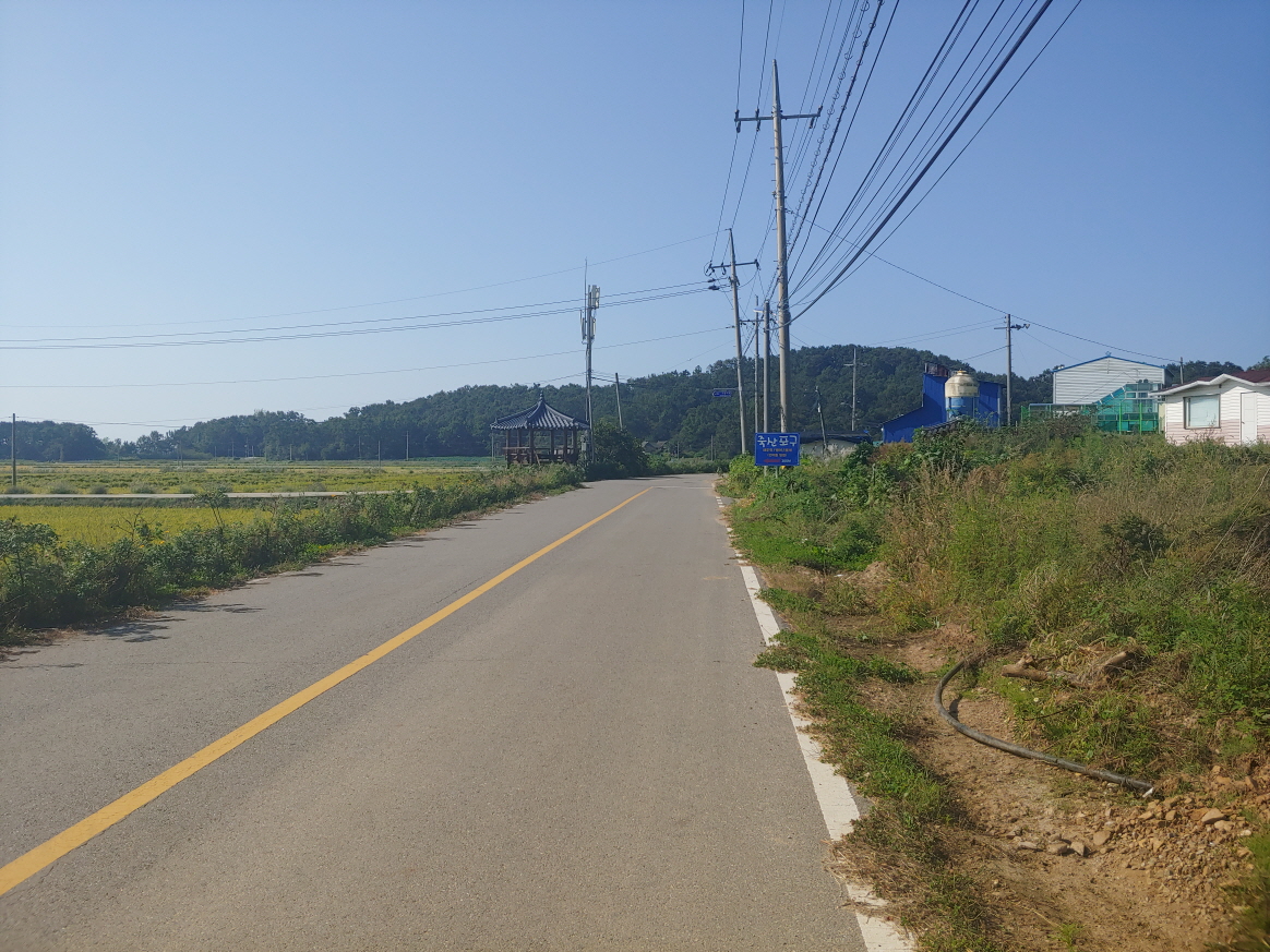 이렇게 논과 농로?라고 해야 하나. 아무튼 도로라고 하기에 좁은 길 사이로 파란색 깃발들이 있다. 이 길을 따라 도로가 생길 예정인지... 근처에 부동산도 없고 검색해도 안 나오고 더 이상 알 수 없었다.