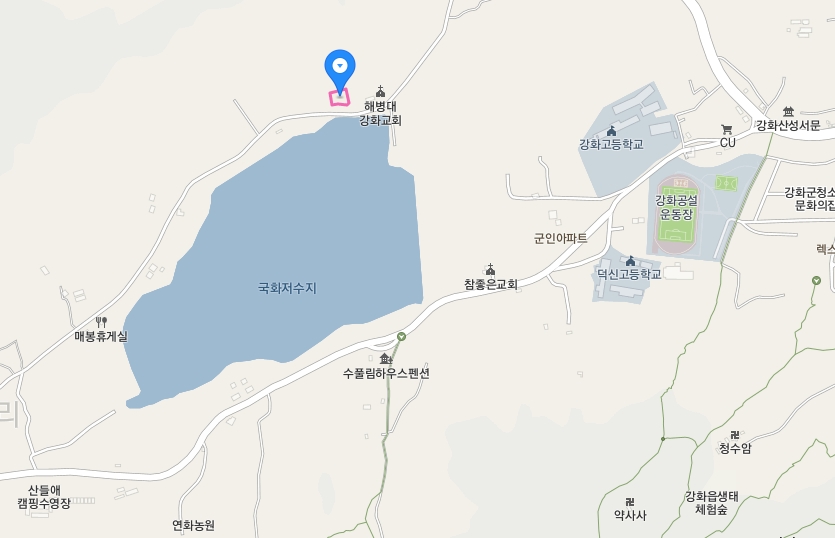 위치는 국화저수지 주변으로 저수지 북측에 있다. 위 지도 오른쪽에 강화산성 서문이 보이는데, 강화대교를 건너서 나오는 강화읍 시내에서 국화저수지까지 거리가 얼마 되지 않는다는 것을 보여준다.