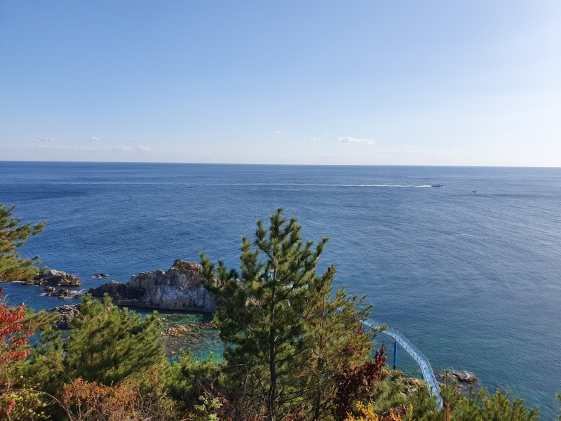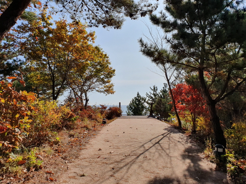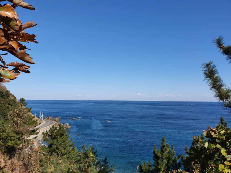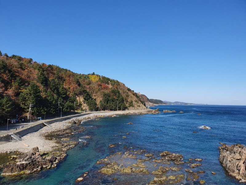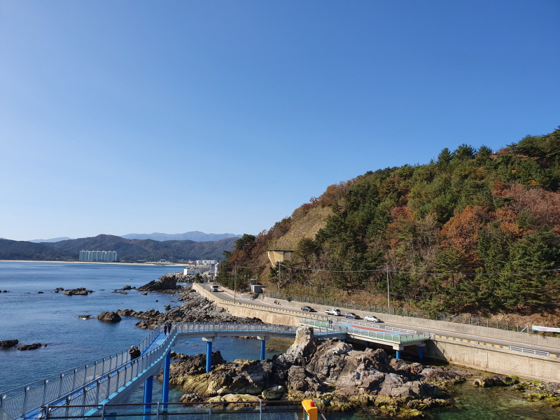 가을 단풍과 해안도로, 푸른 바다가 한눈에 보였다.
