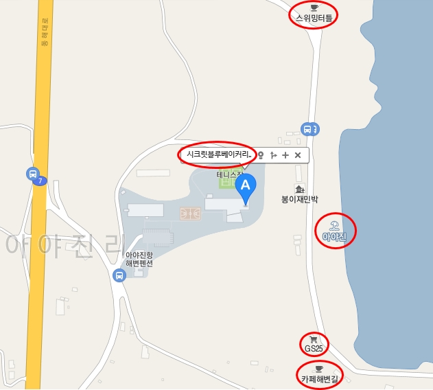 위치는 아야진 해변 바로 옆이다. 네비에 아직 안 나온다면 아야진 리조트로 찍고 와도 된다. 7번 국도를 타고 쭉 오다가 빠질 것이다. 아야진 해변 위쪽으로는 아까 언급했던 '스위밍터틀'이라는 오션뷰 카페가 있고 아래쪽에는 '카페해변길'이라는 오션뷰 카페가 있다. 최근 <노는언니>라는 예능에도 '시크릿블루' 카페와 '카페해변길'이 나왔다.