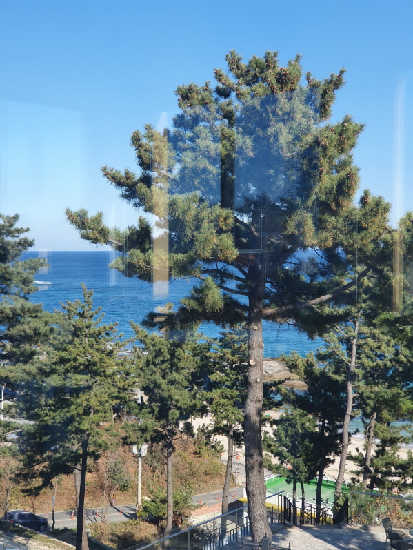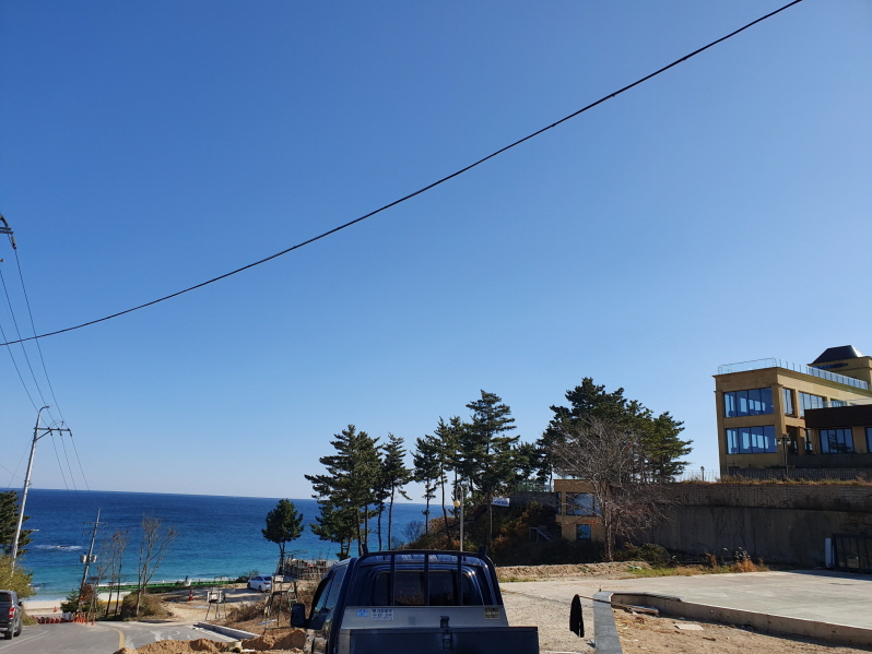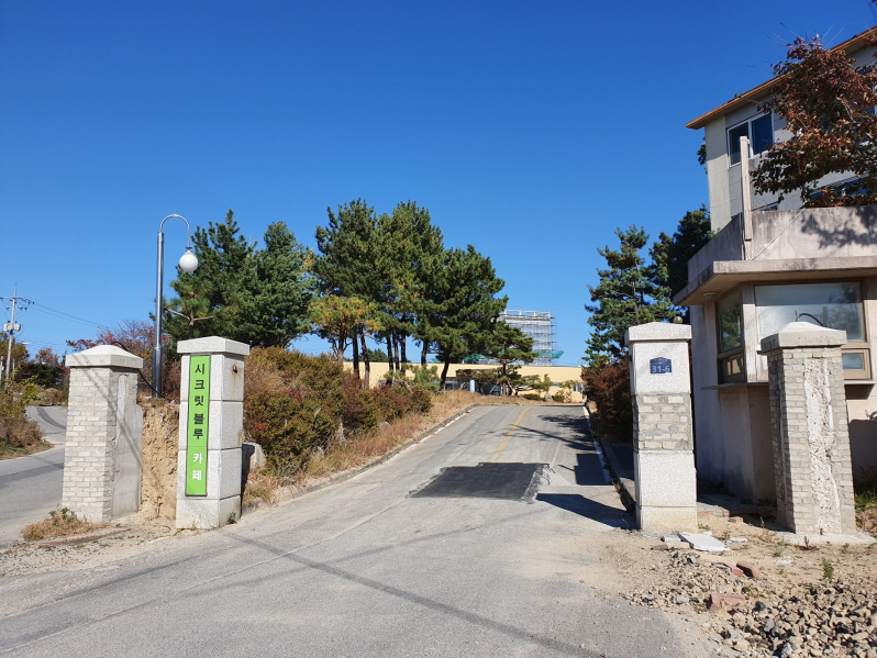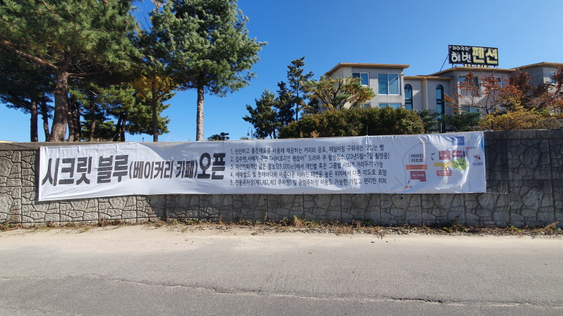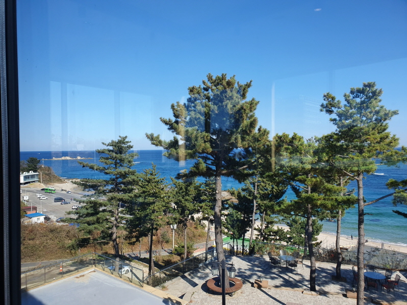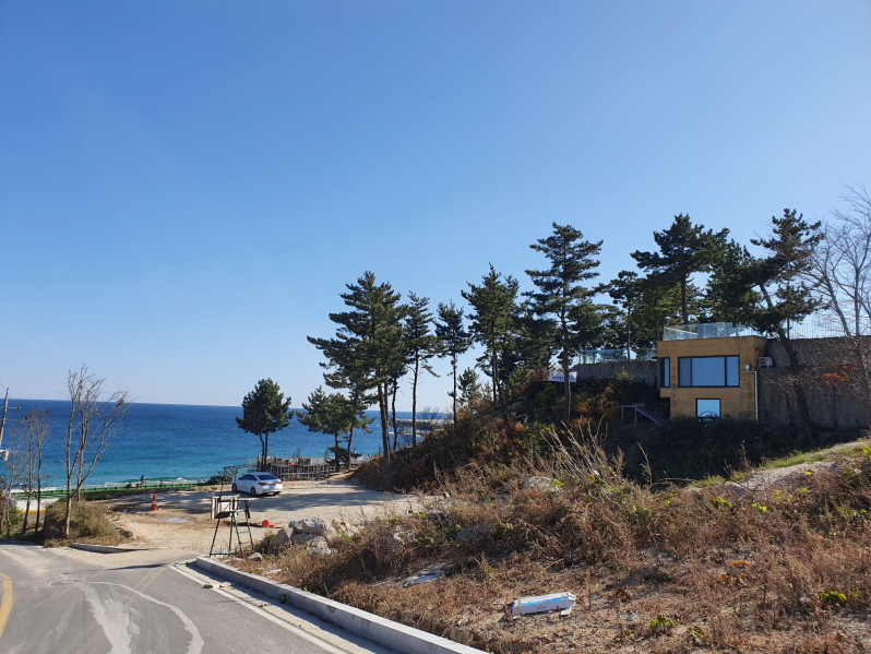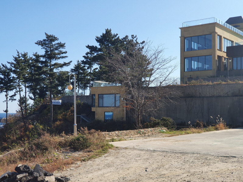 소나무 때문에 좀 가리긴 했지만 아야진 해변이 보이는 카페이다. 원래는 '아야진 리조트'였는데 <사이코지만 괜찮아>라는 드라마의 촬영지였다가 현재는 '시크릿블루'라는 베이커리 카페로 운영 중이다. 사진 왼쪽 끝에 해변에 걸친 흰색 건물은 '스위밍터틀'이라는 카페고, 그 아래쪽 차들이 주차되어 있는 곳은 아야진 해변 공영 주차장이다.