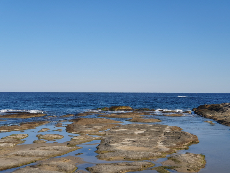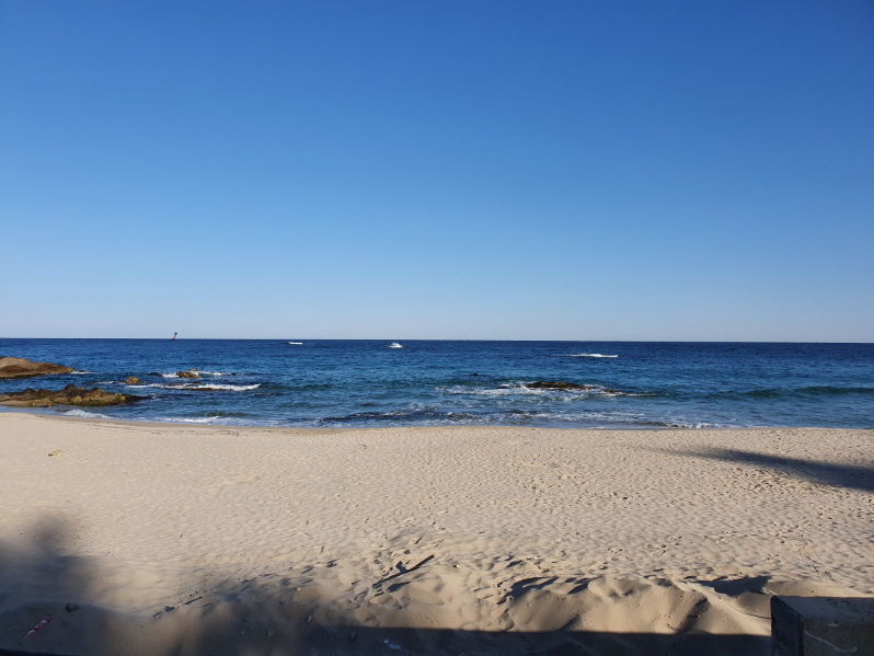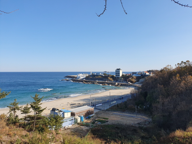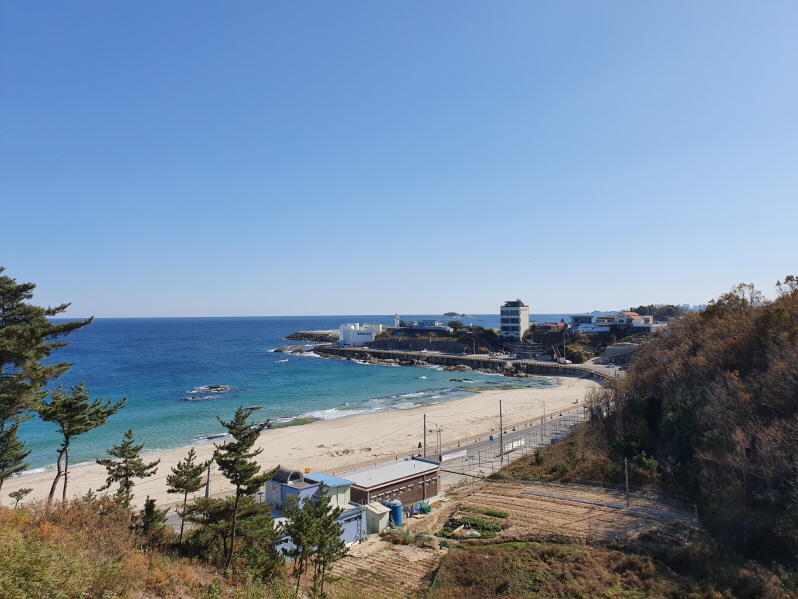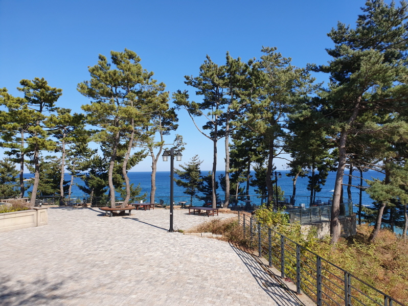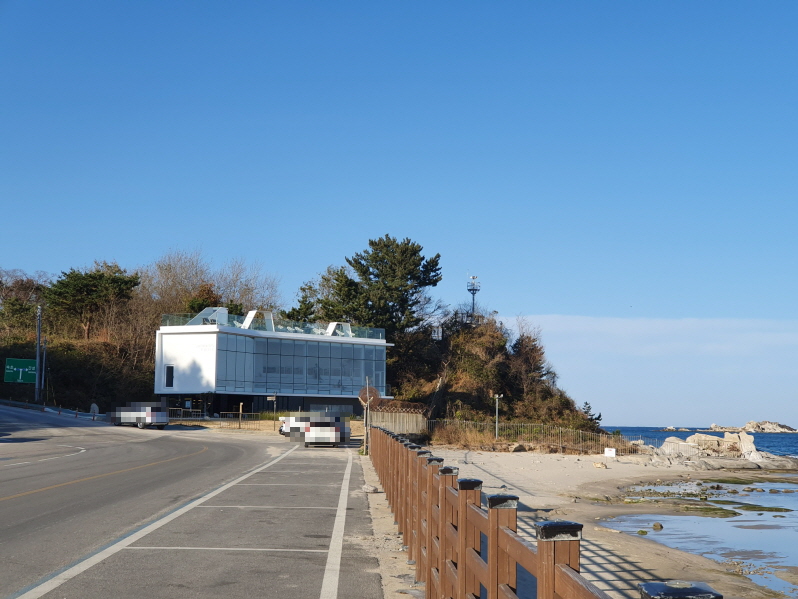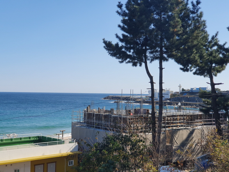 소나무 때문에 좀 가리긴 했지만 아야진 해변이 보이는 카페이다. 원래는 '아야진 리조트'였는데 <사이코지만 괜찮아>라는 드라마의 촬영지였다가 현재는 '시크릿블루'라는 베이커리 카페로 운영 중이다. 사진 왼쪽 끝에 해변에 걸친 흰색 건물은 '스위밍터틀'이라는 카페고, 그 아래쪽 차들이 주차되어 있는 곳은 아야진 해변 공영 주차장이다.