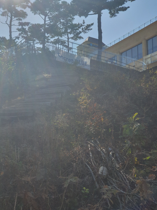 해변 쪽에서 온다면 저 앞에 보이는 계단으로 올라가면 된다. 여기서 봐도 카페 건물에서 통유리를 통해 아야진 해변이 한눈에 보일 것 같다.