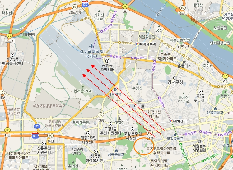 근처에 김포공항이 있다. 화살표로 표시한 활주로 방향 근처에 신월동이 있어서 비행기 이착륙 소음의 영향을 직접적으로 받게 된다. 거리상으로 공항에 더 가깝지만 비행기가 지나가는 방향이 아닌 곳에 위치한 방화동 같은 경우 소음이 덜 하다고 한다. 개화, 방화, 신방화, 마곡도 조만간 임장을 갈 것이다.