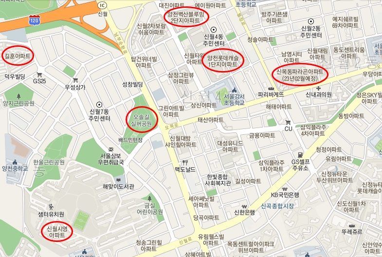 지도를 좀 확대하면 관심을 가질 만한 것이 '신목동파라곤아파트'와 '신월시영아파트' 등이다. 나머지는 그냥 지나가면서 봤기 때문에 표시를 해봤다. 경매 물건은 이미 매각된 것으로 신월4동에서 하나, 신월7동에서 두 개를 보고 왔다.